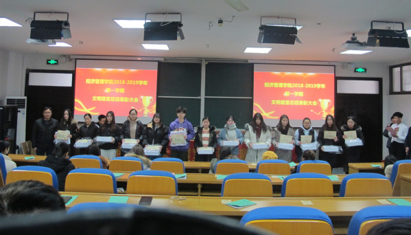 为扎实推进我校“两馆一室”文化建设,发挥朋辈榜样的示范作用,创建“活力四射·书香四溢·和谐融洽·美观洁净”的学生公寓,引导学生成为文明寝室建设的主力军,经济管理学院于12月28日中午在阶东1-1举行文明寝室表彰大会,就本学期开展的“寻找经管特色寝室”和“创建文明示范寝室”活动进行表彰总结。学工部副部长孔慧兰、经济管理学院党总支副书记覃龙飞和学工办全体辅导员出席,获奖寝室和学生代表积极参加。