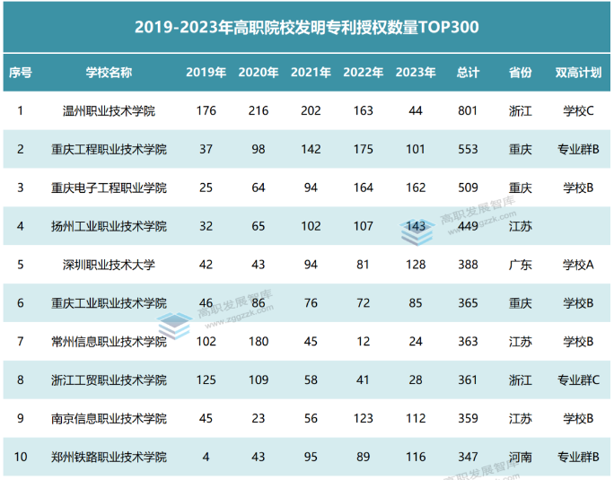 发明专利的数量和质量一直是衡量高职院校自主创新能力的重要指标。“双高计划”建设以来,高职院校高度重视科技创新。日前,高职发展智库对近5年(2019-2023年)全国高职院校发明专利授权数量进行了统计分析,以此观察首轮“双高计划”建设期各高职院校在发明专利方面的表现情况。