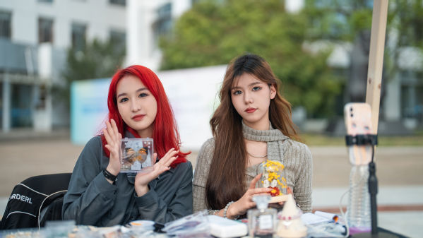 来自艺术设计学院的徐同学售卖的是饰品,她的营业额也位列前茅,她的获客密码是“直播”,比起线下发传单去推广自己,我在线上直播宣传自己,也吸引到了很多校内的同学去关注,形成了线上宣传+线下通过产品本身的品质吸引客户、留住客户。本次市集结束时,她也涨了不少粉丝。