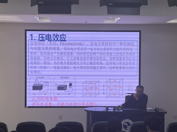 王博士从电子烟、打火机等日常物品入手引入了压电效应概念。从铁电材料压电技术的历史、分类、特点、发展及市场等方面做了整体介绍,从转换性能、机械性能、电学性能、环境适应性、时间稳定性等方面对铁电材料的压电参数进行宏观描述,从原子间的相键间作用力方面进行微观展示。生动形象的让学生了解铁电材料产生压电效应的原理与压电特性。
