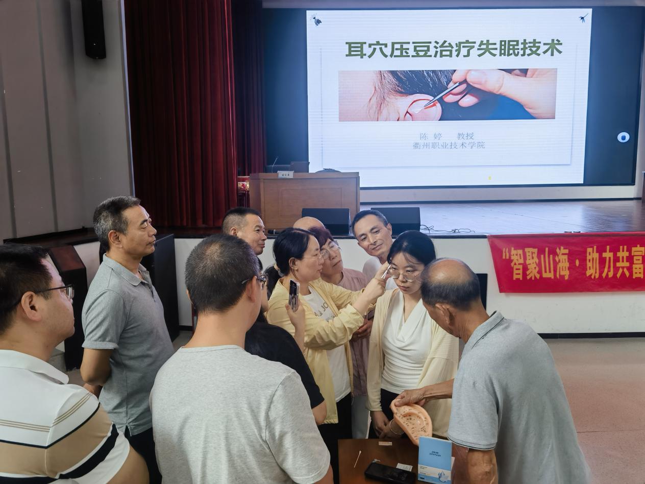 本次培训特邀我校针灸推拿专业教师团队进行授课,此次培训内容详实、实用性强,采取理论与实践相结合的授课方式。课程内容紧贴基层临床实际,涵盖耳穴贴压治疗失眠、刮痧治疗感冒、撮痧治疗中暑、三伏贴治疗支气管哮喘、穴位敷贴治疗急慢性支气管炎、中药热敷治疗膝关节炎等多个实用领域。学员们学习热情高涨,与老师们积极互动,课堂氛围热烈。