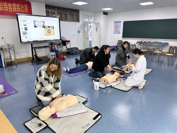 本次培训邀请了医学院专任教师周敏、张佩情、李良秀三位教师为老师们讲解理论知识并详细介绍了心肺复苏(CPR)、自动体外除颤器(AED)的使用、海姆立克急救法以及如何正确拨打120等关键技能。随后,在专业教师的指导下,大家进行了实际操作演练,通过模拟各种紧急情况,进一步巩固了所学知识。整个培训气氛十分活跃,辅导员们纷纷动手实践,认真练习,确保在实际操作中能够熟练掌握各项技能。
